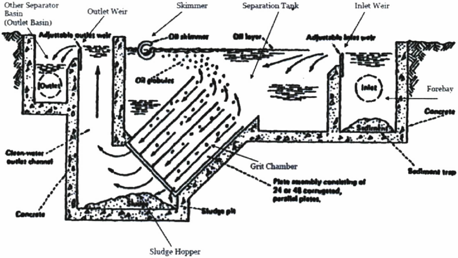 Notably, the definition in Subpart QQQ exactly describes this diagram. All of the components listed in Subpart QQQ (separation tank, forebay, other separation basin, skimmers, weirs, grit chamber, and sludge hopper) are identifiable on the diagram, and they are components of the separators as described by EPA. See Background for Proposed Standards, supra, at 3–30.